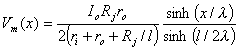 A mathematical description of Vm over the extent of the cell starts with the governing differential Equation 9.4. If we choose the origin at the center of the cell, then the solution to 9.4 should be chosen in terms of sinh(x/λ) to obtain the expected antisymmetry. From Equation 24.1, but including the junctional resistance's contribution to the net intracellular resistance per unit length, we have