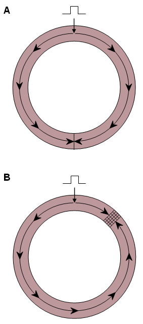 In normal activation of the heart propagation ceases when conduction reaches the boundaries of the myocardium. At this point, there is no longer any tissue available that is not in the refractory state. When the next beat is initiated at the SA node, the entire heart is quiescent, and the ensuing process is a repetition of previous ones. The significance of the occurrence of reentry is that the normal pacemaker-initiated process is bypassed. If, as is usual, the activation cycle is very short, then the tissues undergoing reentry serve is a stimulus site for driving the entire heart at a faster rate (tachycardia).