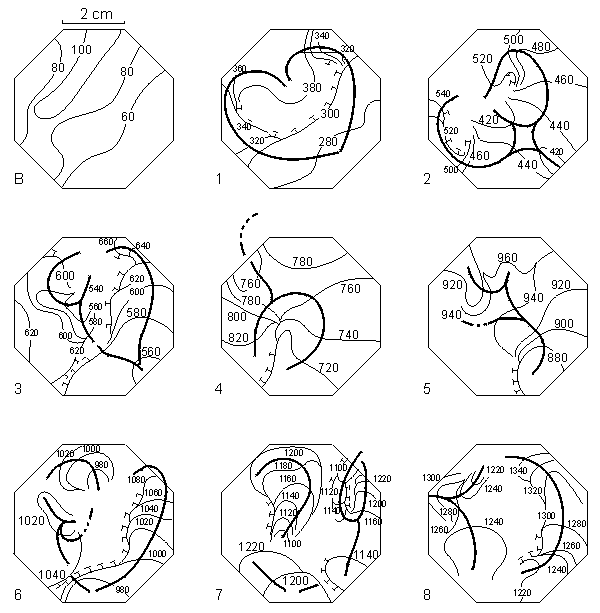 Fig. 24.2 Actual maps of the spread of activation during the onset of tachycardia induced by a premature stimulus in an isolated rabbit heart atrial preparation.