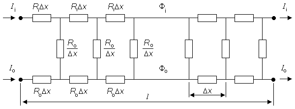 Fig. 24.4 Core-conductor electric network for a single cell that is a component of an equivalent single cardiac fiber. The cell is connected to its neighbors by an intracellular coupling resistance, Rj, at its ends. Steady-state subthreshold conditions are assumed.