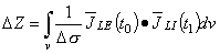 In Equation 25.1, the region v consists of an inhomogeneous volume conductor whose conductivity (as a function of position) at time t0 is σ(t0). At t1, this has changed to σ(t1), and it is this change (t1) - (t0) = Δσ which is responsible for the measured impedance change ΔZ. Thus Equation 25.1 describes how the changes in volume conductor conductivity are converted into the impedance change evaluated from a measured voltage (at the voltage electrode pair) divided by applied current (at the current electrode pair). Note that the 4-electrode impedance method underlies Equation 25.1.