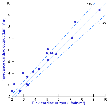 They used the Fick principle as a reference for evaluating stroke volume. (The Fick principle determines the cardiac output from the oxygen consumption and the oxygen contents of the atrial and venous bloods.) In a study of six subjects at various exercise levels, the correlation between the impedance and Fick cardiac outputs was r = 0.962, with an estimated standard error of 12% of the average value of the cardiac output.